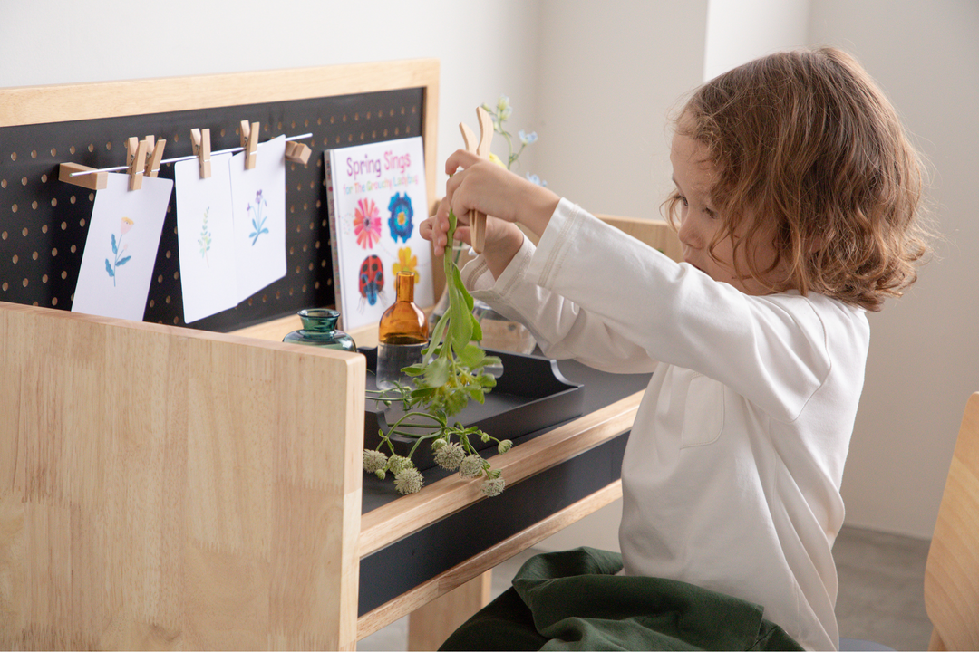 そんなモンテッソーリ教育への尊敬と共感から生まれた知育家具ブランド・MINORINO(みのりの)のキッズデスクはリビングにこそ置きたくなるデザインと機能で、 子どもの「考えたい」「動きたい」を自然に引き出します。